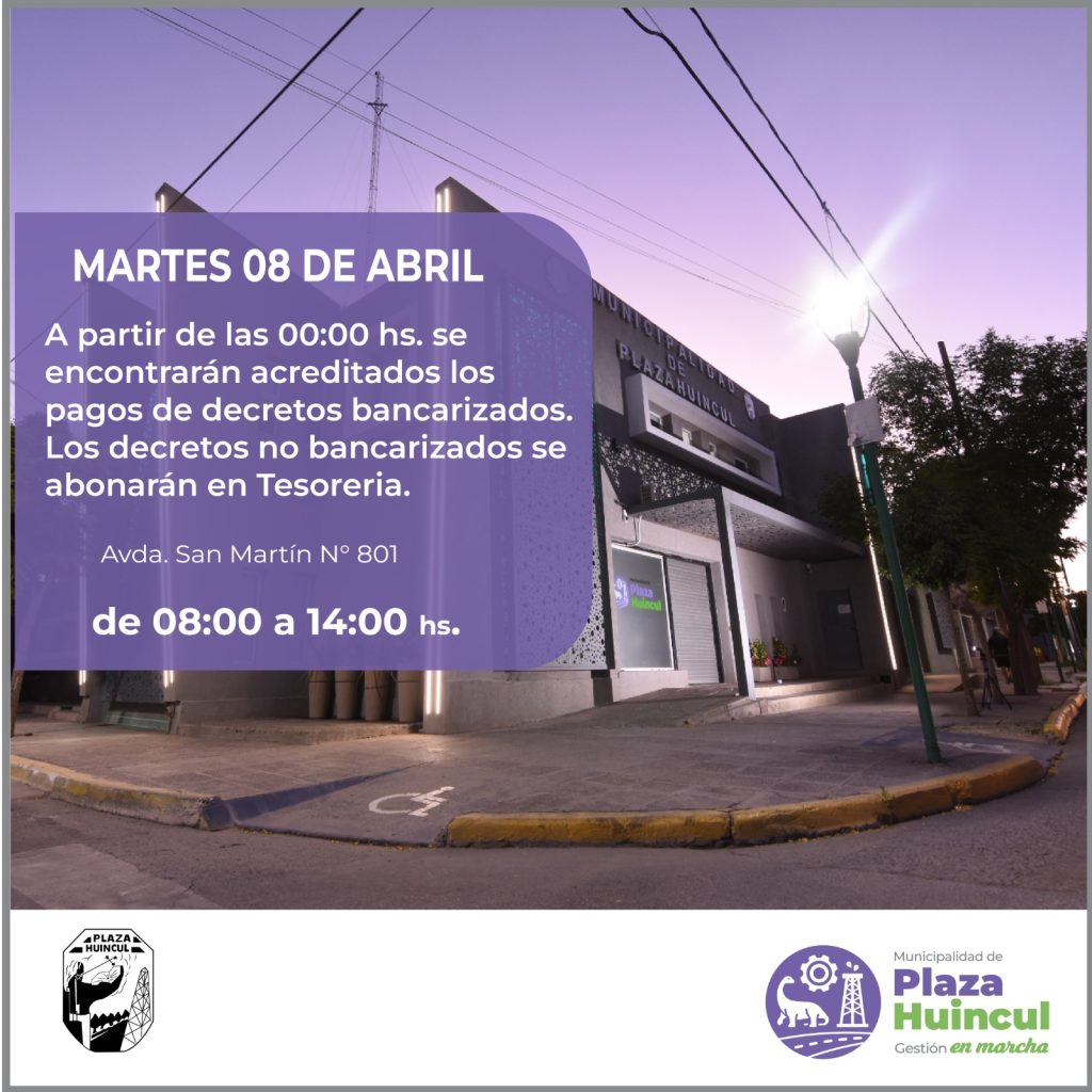 Desde Hacienda de Plaza Huincul se informó que este martes 8 de abril se llevará a cabo el pago correspondiente al personal encuadrado bajo la modalidad de Decretos.