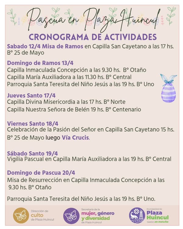 La Dirección de Culto de Plaza Huincul dio a conocer el cronograma de celebraciones litúrgicas que se desarrollarán en distintas capillas y parroquias de la ciudad con motivo del Domingo de Ramos y la Semana Santa. Las actividades comenzarán el próximo domingo 13 de abril y se extenderán hasta el domingo de Pascua, 20 de abril, con misas, vigilias y vía crucis que convocan a los fieles de todos los barrios.