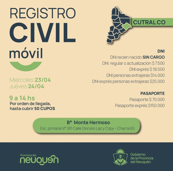 El Registro Civil Móvil estará presente en la ciudad de Cutral Co los días miércoles 23 y jueves 24 de abril, brindando la posibilidad de realizar trámites de documentación sin necesidad de trasladarse a otras localidades. La atención se realizará en la Escuela Primaria N° 281, ubicada en Calle Dionisio Laz y Copy, en el sector Chacra 60 del barrio Monte Hermoso, en el horario de 9 a 14 horas.