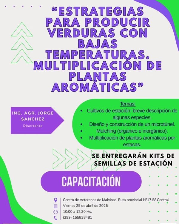La Subsecretaría de Producción y Agricultura Familiar, en articulación con el Instituto Nacional de Tecnología Agropecuaria (INTA), llevará adelante una jornada de capacitación bajo el título “Estrategias para producir verduras con bajas temperaturas – Multiplicación de plantas aromáticas”, una propuesta destinada a fortalecer las prácticas agroecológicas y promover la soberanía alimentaria en la región.