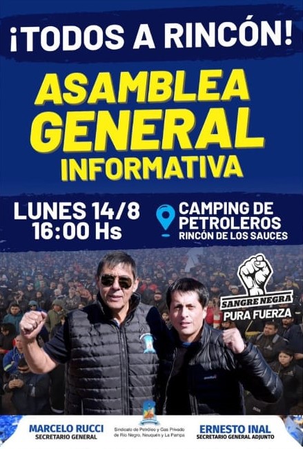 El Sindicato de Petroleros Privados de Rincón de los Sauces anunció que habrá una asamblea general informativa programada para el lunes 14 de agosto a las 16:00 horas. La cita tendrá lugar en el Camping del Sindicato, y se espera que sea un evento de gran relevancia para los trabajadores del sector.