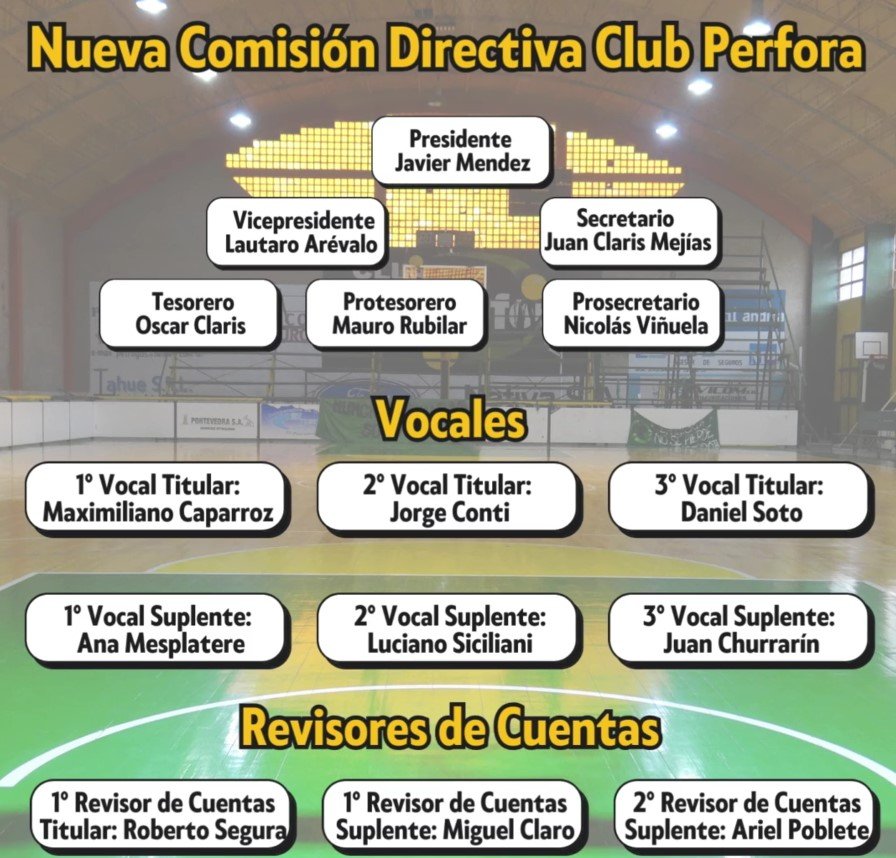El pasado sábado se conocieron los nuevos integrantes de la comisión directiva del Club Pérfora. Javier Mendez fue reelecto como presidente de la institución.