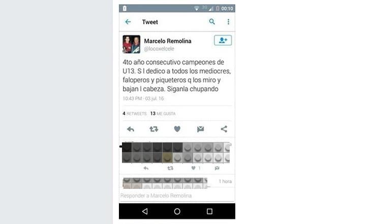 Al término del encuentro el técnico Marcelo Remolina (@locoxelcele en Twitter) dedicó un posteo a sus rivales (entre los que hay niños de 11 y 12 años). Sin distinción de jugadores, técnicos, dirigentes o vecinos de Plaza Huincul, Remolina dedicó el triunfo a “los mediocres, faloperos y piqueteros” a los que “miro y bajan la cabeza” para terminar con una agresión de tipo sexual.