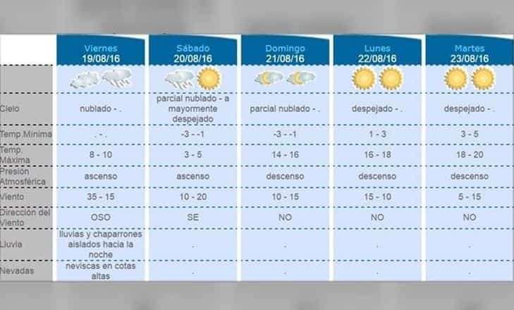 Para el domingo las máximas rondarán en 14 y 16º con viento leve de 10 a 15 kilómetros por hora desde el noroeste. Mientras que el lunes contará con mínimas de 1 a 3º y máximas de 16 a 18º C con cielo despejado. Se estima que con el pasar de los días las temperaturas irán en ascenso hasta rondar los 20º.