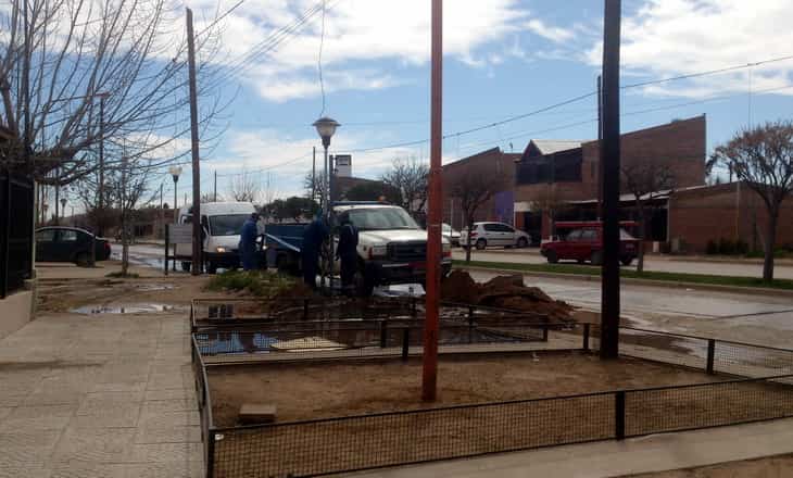 Fue en la esquina de Eguinoa y 12 de Octubre, durante las tareas de zanjeo para la instalación de postes de alta tensión que llegarán al supermercado La Anónima del barrio Pueblo Nuevo. La rotura provocó una pérdida de más de 9 cuadras hasta desembocar en el canal colector.