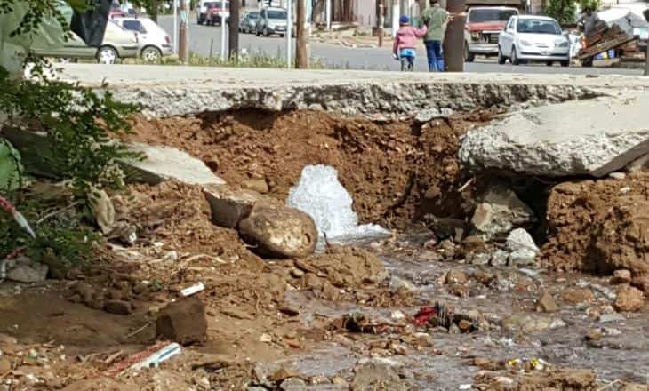 La pérdida se registra en Rivadavia y Sarmiento y corre por varias cuadras. En este caso la pérdida parece recurrente porque se rompió una vereda para acceder al caño.