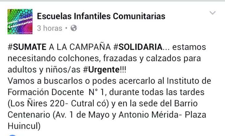 Es por eso que impulsan la recolección de ropa, abrigo, frazadas y calzado en el Instituto de Formación Docente N°1 y en la sede del barrios Centenario de Plaza Huincul.