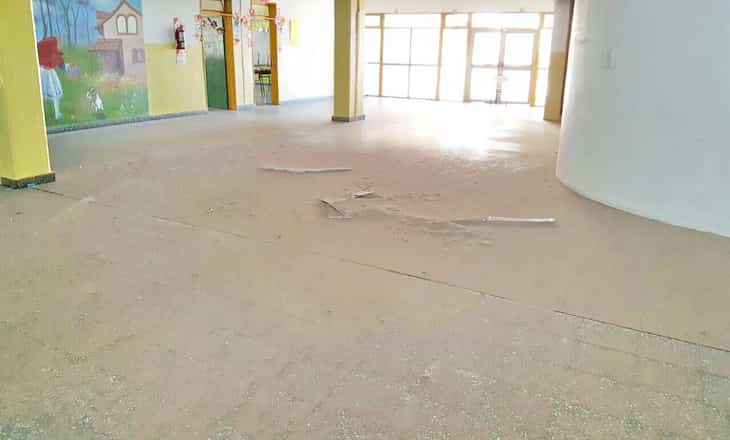 Tal como se indicó desde la institución, las clases siguen suspendidas desde el lunes de la semana pasada cuando se observó el desprendimiento y caída de dos placas de durlok y una tercera que quedó suspendida. Este material forma parte del cielorraso del SUM. Junto a las placas cayó también una importante cantidad de arena.