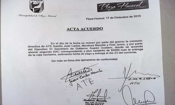 En las redes sociales figura un acta firmada entre el representante de ATE, Carlos Santos junto a Jesús Díaz, el secretario de Gobierno, Gustavo Suárez y Marcela Mendoza, pero se trata de un acuerdo firmado en el año 2015, porque hasta el momento no hay una fecha precisa del pago a los empleados municipales.
