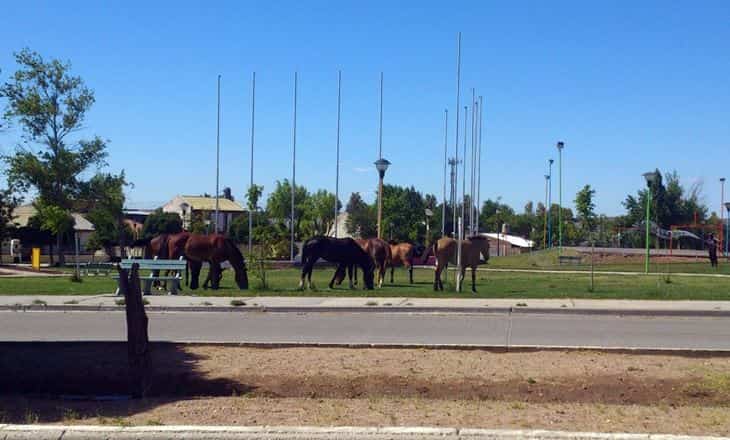 Una tropilla de 7 equinos pasó la mañana pastando en Plaza de los Inmigrantes. En Huincul se dio una situación similar entre Plaza Integración y la rotonda de las banderas.