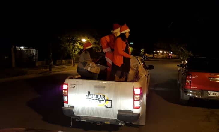 En una camioneta, Papa Noel se sacó fotos con los niños y entregó bolsitas con golosinas, lo que trajo alegría a aquellos que no habían recibido ningún regalo en la nochebuena. A poco de recorrer los barrios del sur de la ciudad se generó una caravana que acompañó la entrega de las golosinas.