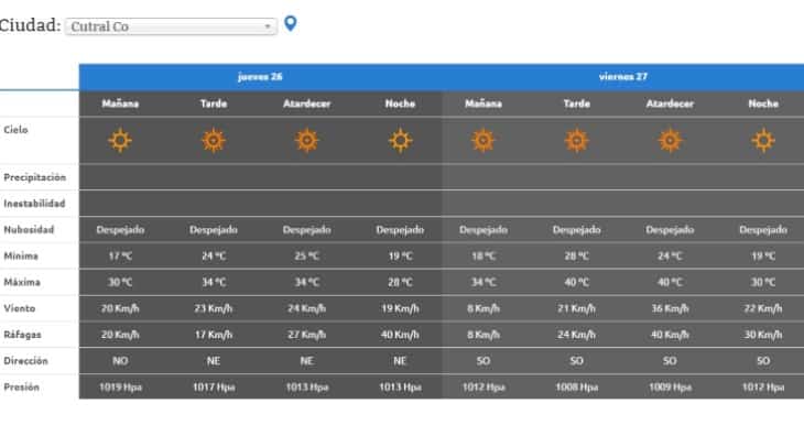 Para hoy el pronóstico de AIC anuncia una máxima de 34 grados centígrados con viento del sector noreste a 27 km/h, el cual irá en aumento hacia la noche. A partir de mañana las temperaturas aumentarán hasta los 40°C con un cielo mayormente despejado y periodos ventosos moderados.