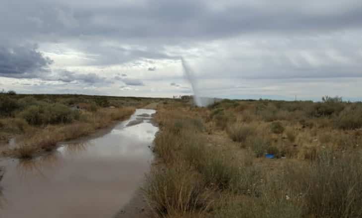 El sitio donde está la pinchadura del caño de agua se ubica en la zona de la curva por la que se desciende del club Pérfora en el barrio Uno de Plaza Huincul. Se observa a unos 500 metros hacia la zona del campo y por donde hay un camino de acceso a las locaciones.