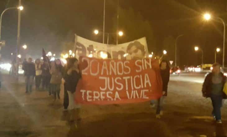 Después de las 20:30, la columna que encabezaba una pancarta en la que se leyó “20 años sin justicia, Teresa Vive”, se dirigió por la avenida San Martín hasta llegar al puente de la ruta 17 y que también lleva el nombre de la mujer asesinada el 12 de abirl de 1997.