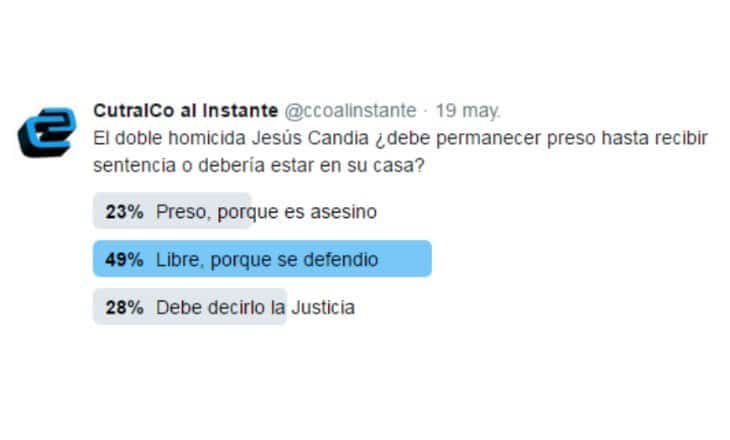En la cuenta de Twitter de Cutral Co al Instante se realizó una encuesta en la que se preguntaba sobre si Candia debía estar preso o recuperar la libertad.