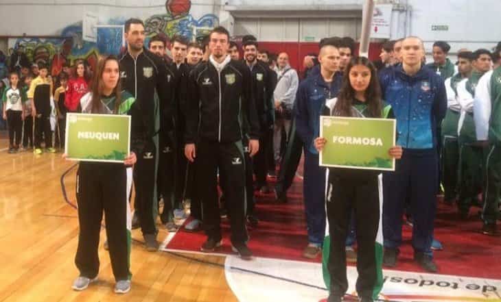 El acto contó con todas las delegaciones y con abanderados como históricos del Básquet Neuquino en la Nacional y con Barbará Araoz, que es una neuquina que está en las ligas de Estados Unidos, como abanderada de la provincial.