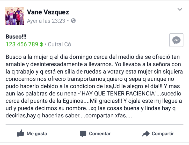 A través de la comunidad Subastas, una mujer difundió un mensaje para llevar su agradecimiento a la mujer que el domingo la llevó a votar.