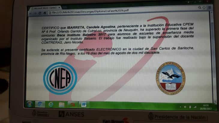 La alumna del CPEM 6, Candela Ibarreta se postuló para la beca, fue seleccionada en el puesto 75 entre 500 trabajos.