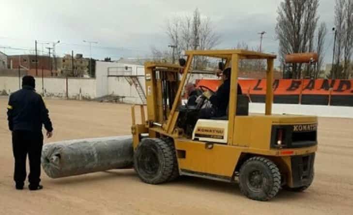 Ayer llegaron los instaladores de césped sintético a Plaza Huincul y hoy ya se presentaron las alfombras en el terreno de juego. Esperan terminar en 15 días.