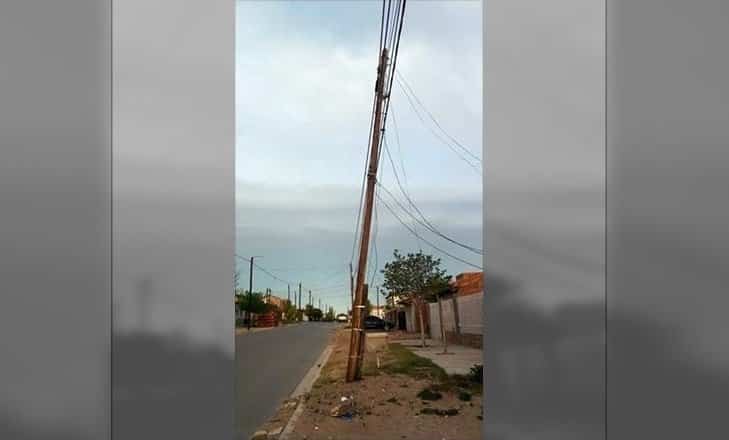 Según los vecinos, el temporal de vientos de agosto con ráfagas que superaron los 100 kilómetros por hora, dejó el poste con una notoria inclinación hacia las viviendas con un riesgo potencial de caída. En primera instancia fue reforzado con un segundo poste como tutor, pero aseguran que no es estable y que lentamente continúa inclinándose.