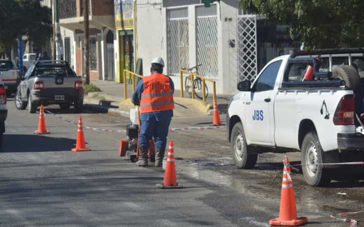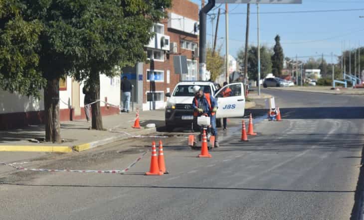 Se realizan tareas de arreglos a la altura del BPN, la sucursal que está sobre avenida San Martín. La Municipalidad contrató una empresa para el bacheo en toda la ciudad.