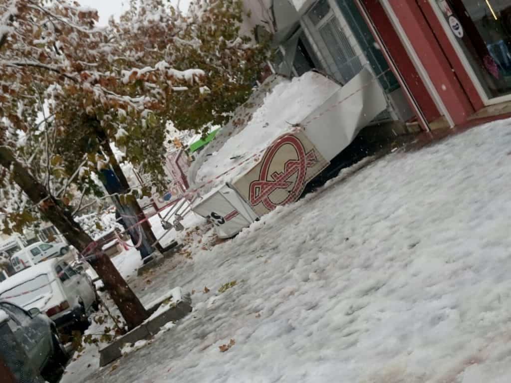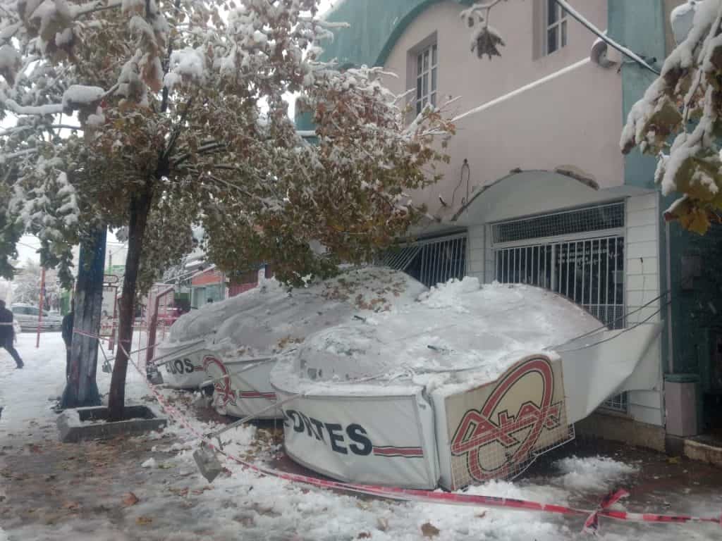 El cartel que está en la casa central de la tienda de calzados Calá, se desplomó también sobre la vereda, se estima que por el peso de la nieve. Es el que está sobre la calle Roca y quedó tirado sobre la vereda.