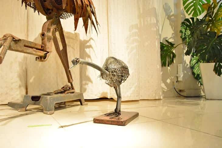 Esta exposición tiene como protagonista al escultor Ezequiel Zapata, quien desde Piedra del Águila muestra su arte. El artista, nació entre fierros y herramientas de la metalúrgica que tenía su familia. Sus obras, a partir de la observación y admiración, permiten transformar la vieja “chatarra”. Y así dejan de serlo, para cobrar vida y poder verla, a través de los ojos del artista.