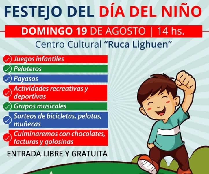 En el Centro Cultural Ruca Lighuen de Huincul: A partir de las 14: habrá juegos, peloteros, payasos, grupos musicales, juegos deportivos, sorteos de bicicletas, muñecas y pelotas. Se concluirá con chocolates, facturas y golosinas. La entrada es gratuita.