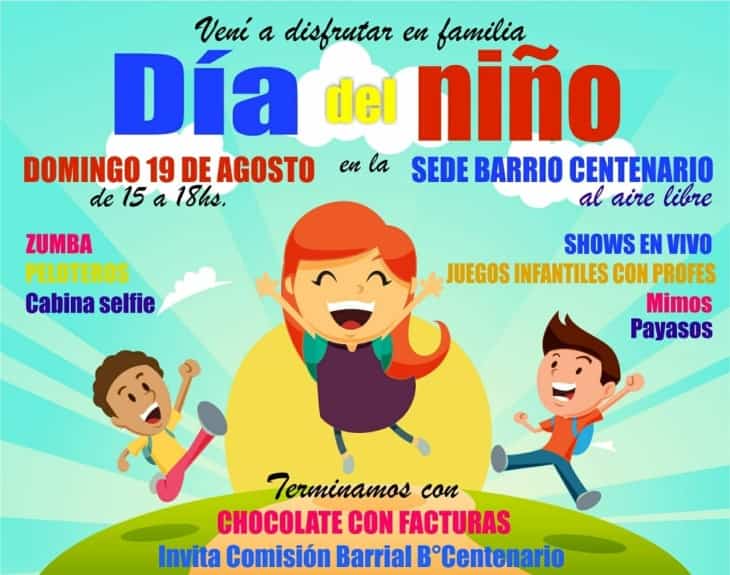 En el barrio Centenario de Huincul: desde las 15 hasta las 18. Se tiene previsto peloteros, cabina selfie, shows en vivo, juegos con profesores, mimos, payasos, zumba y el cierre será con chocolate y facturas. La sede queda en avenida 1 de Mayo y Mérida.