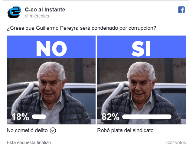 La pregunta de la encuesta fue ¿Crees que Guillermo Pereyra será condenado por corrupción? y el 82% consideró que si porque robó plata del sindicato, mientras que el 18% consideró que no, porque no había cometido delito.