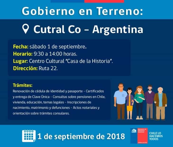 Desde la comuna cutralquense se informó que la actividad la propuso el Consultado de Chile y se denomina “Gobierno en Terreno”. En ese lapso de tiempo, atenderán las demandas de los residentes chilenos en el país.