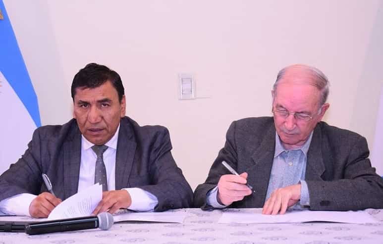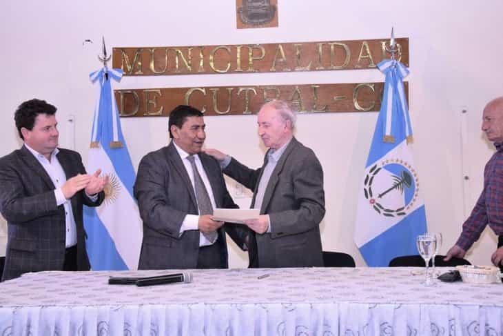 El intendente José Rioseco y el presidente del CCI, Carlos Arens rubricaron el acuerdo en el salón “Américo Verdenelli” de Cutral Co esta mañana.