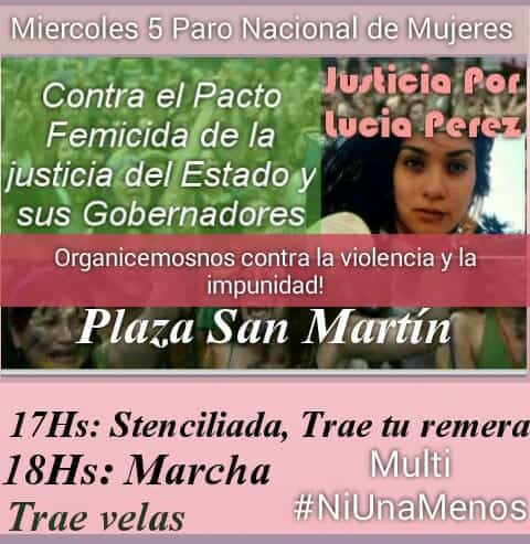 Esta actividad está contextualizada con el reclamo que se lanzó a nivel nacional, por el colectivo #NiUnaMenos después de conocer el fallo en el juicio por el femicidio de la joven Lucía Pérez. El Tribunal absolvió por abuso sexual y femicidio a los responsables del asesinato de la joven marplatense y sólo los condenó por la tenencia de estupefacientes. Habrá movilización en todo el país.
