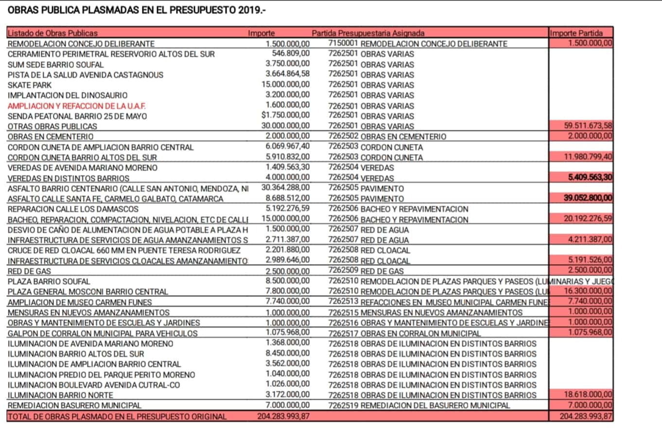 Entre lo más destacado figura la remodelación del Concejo Deliberante por un millón y medio de pesos; la implantación de un parque de dinosaurios con réplicas gigantes por $3.200.000, que se había interpretado como la reparación del viejo dinosaurio y se aclaró que es un nuevo parte. También incluye un Skate Park por 15 millones; 39 millones es asfalto, 20 millones en bacheo y demás obras de bacheo, iluminación y reparaciones.