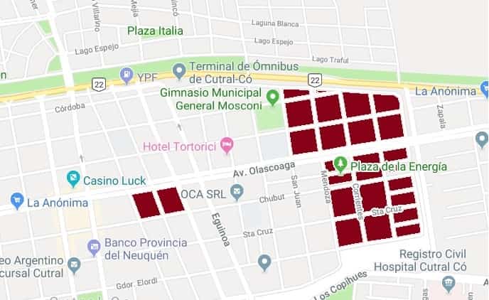 En el caso del barrio Centro, la cuadra afectada está entre Perito Moreno e Yrigoyen; y de Olascoaga a Chubut.