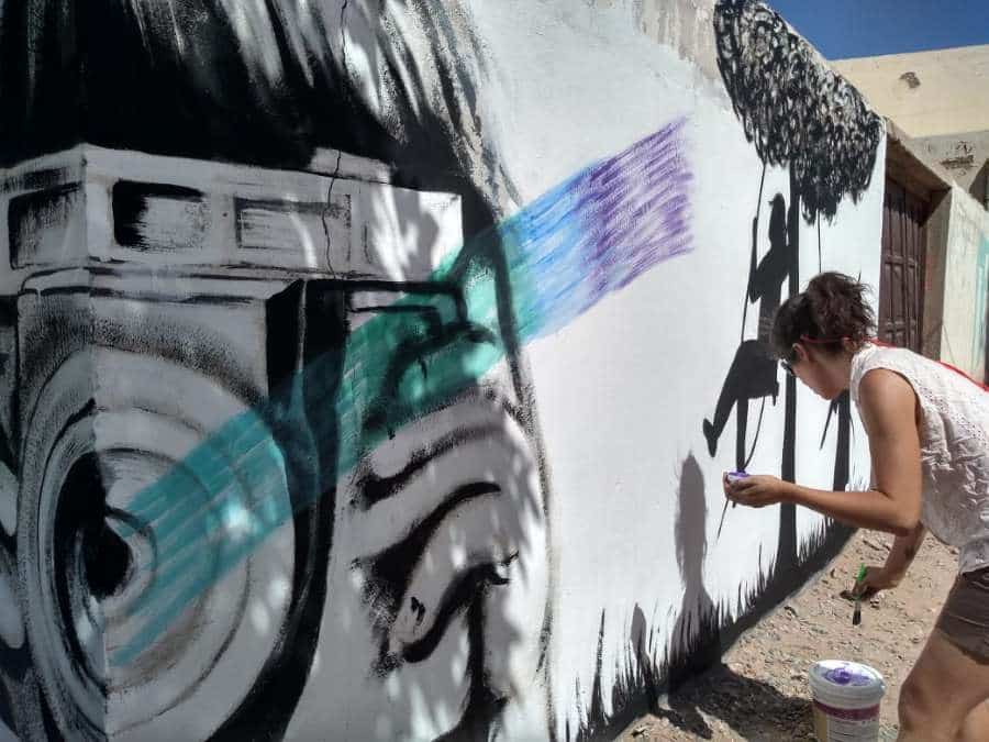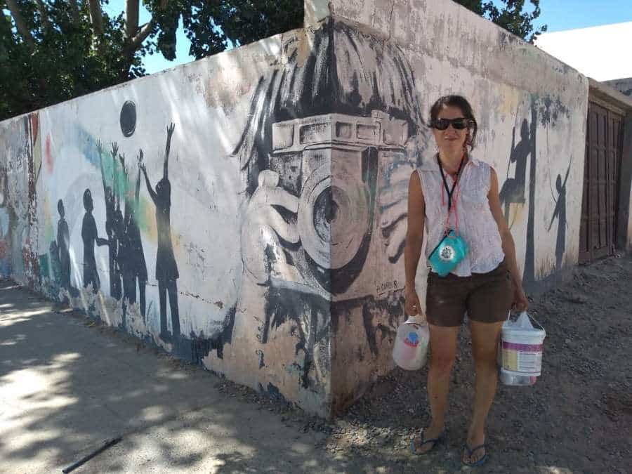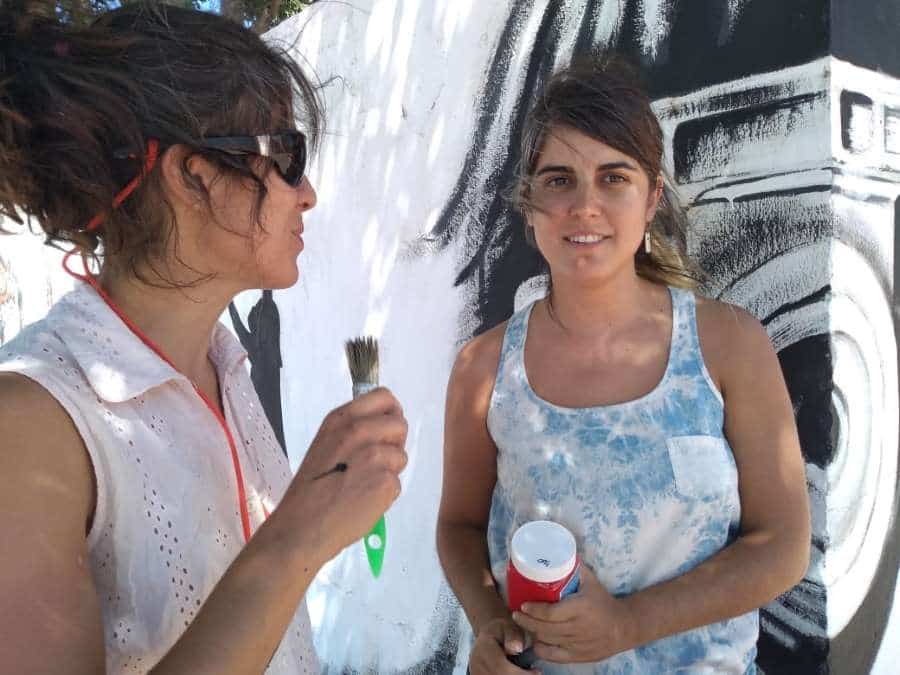 Junto a su hermana, Andrea revivió el mural que había pintado con la Dirección de Juventud de Plaza Huincul frente a la comisaría sexta.