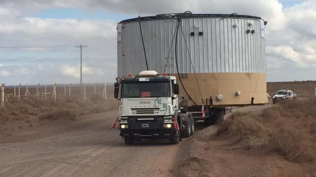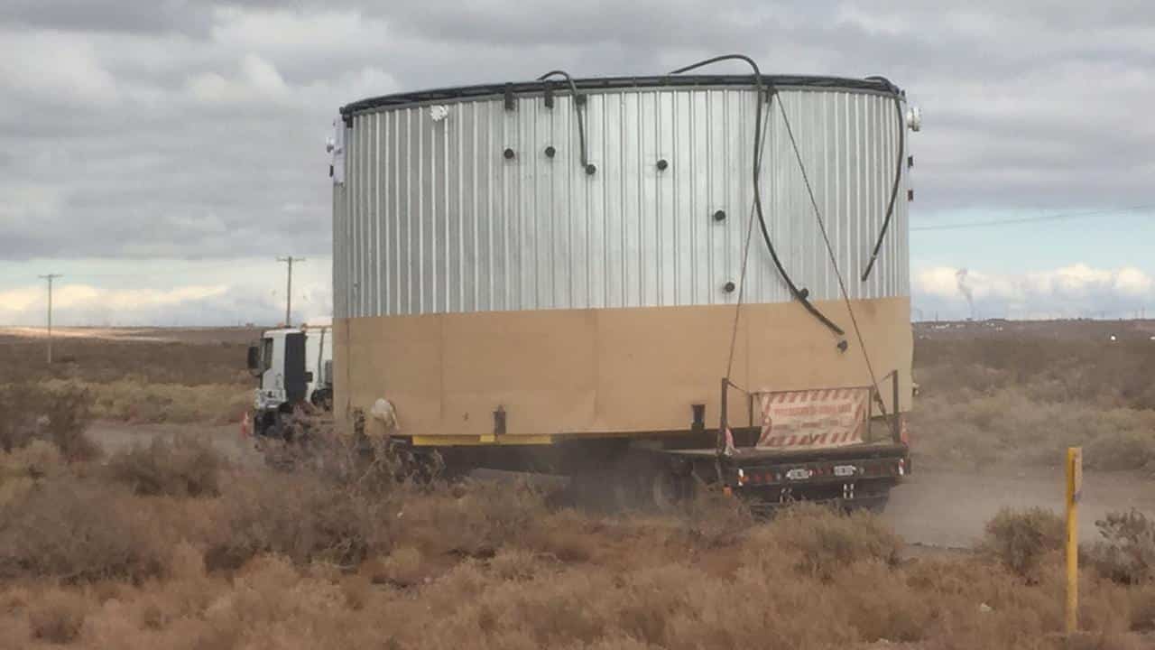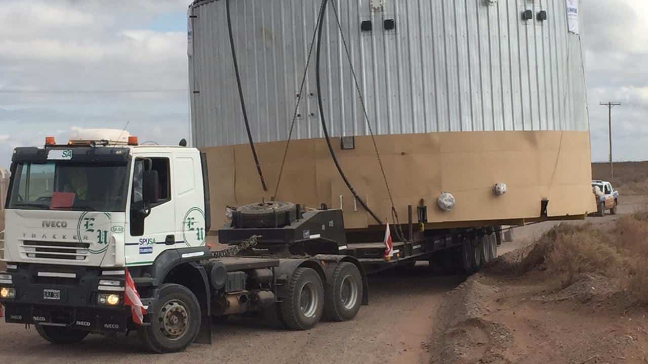 Este viernes concluyeron las tareas de traslado de este tanque que había salido del predio de la empresa El Pampeano SRL, donde fue construido. El destino fue el yacimiento Bandurria.