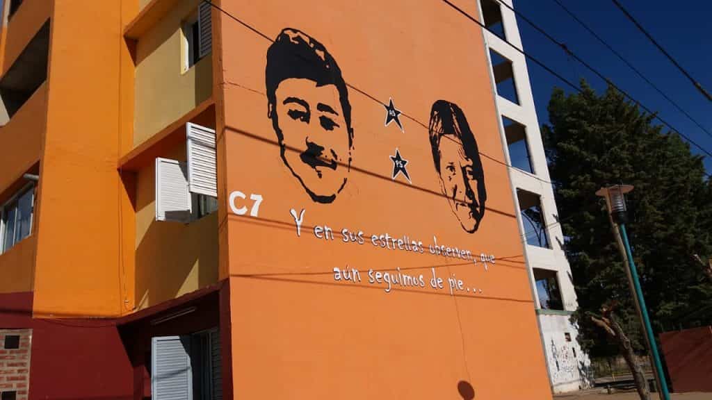 El mural fue pintado en el bloque C7 del barrio Mosconi, con la leyenda “y en sus estrellas observen, que aún seguimos en pie”.