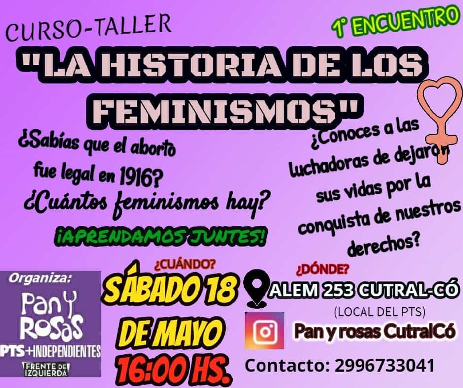 El taller se realizará en Alem Nº 253 de Cutral Co, en el local del PTS, Pan y Rosas de Cutral Co