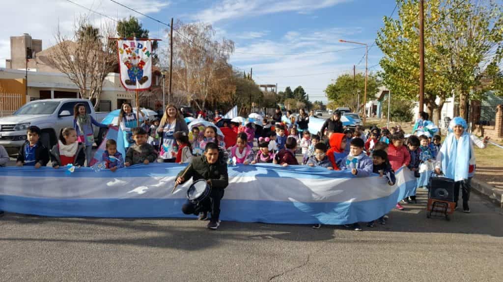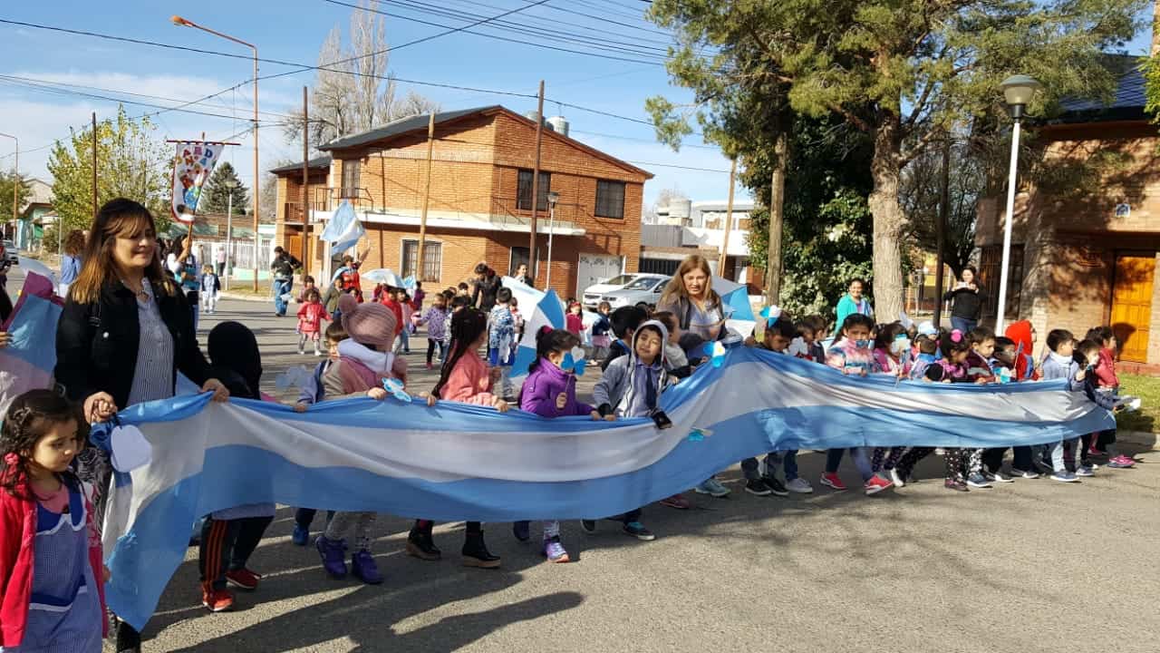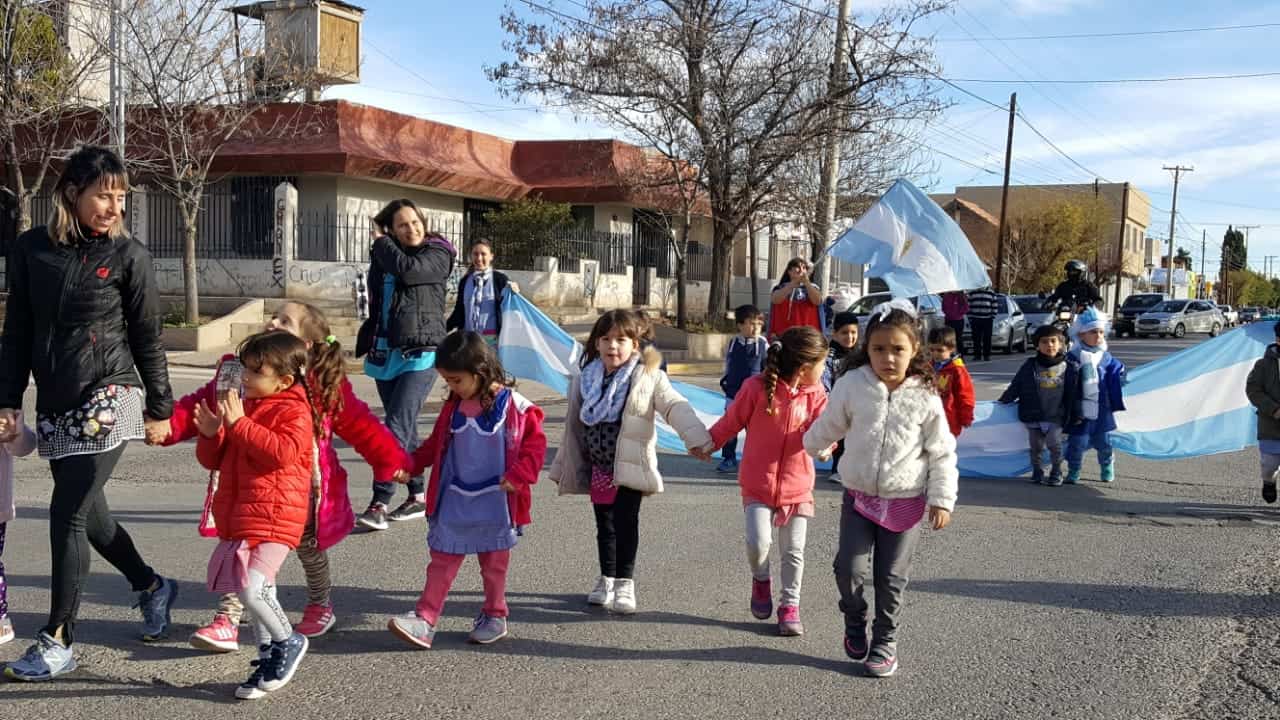 Y en esta ocasión, las seños y profes organizaron un “Banderazo”. Para ello, con una gran bandera, recorrieron las inmediaciones al edificio escolar. Las chicas y chicos, con banderines, paraguas, gorros, caminaron desde las puertas del jardín situado en Chubut y San Juan, con destino a Eguinoa. Desde allí, siguieron hasta la avenida Olascoaga hasta retornar por San Juan al punto de partida.