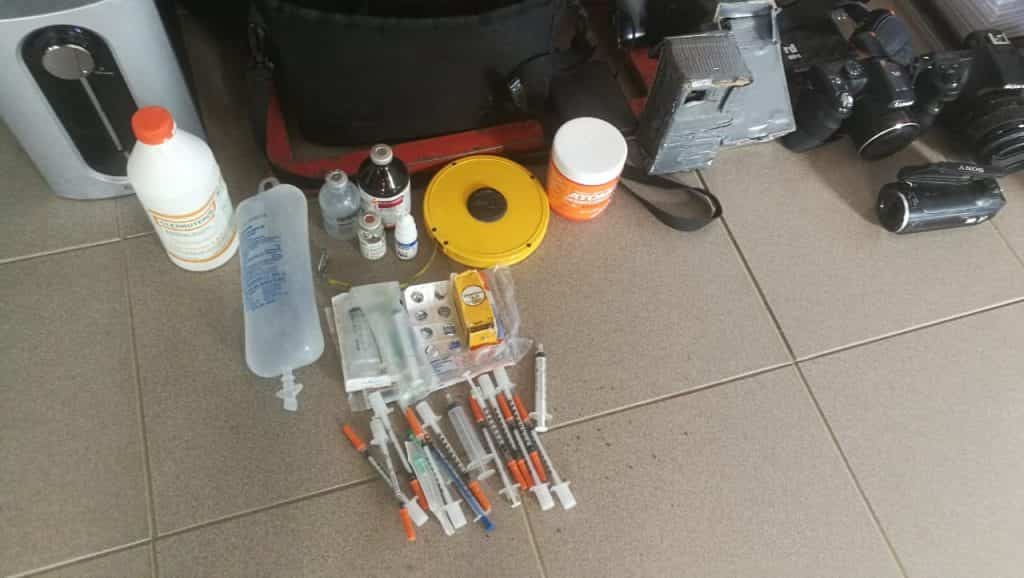 Se confirmó que había jeringas y otros elementos de medicina veterinaria, con las que tratarían a los perros galgos para conseguir ganar carreras.
