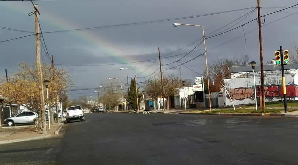 La caída de lluvia débil en algunos sectores este sábado por la tarde y que produjo además con la presencia del sol un nítido arco iris, en el cielo de la comarca petrolera, continuará con el pronóstico de nevadas débiles y lluvias moderadas para esta noche.