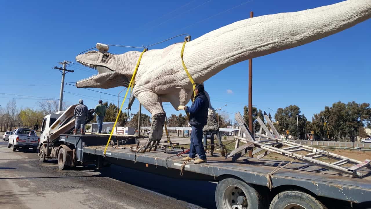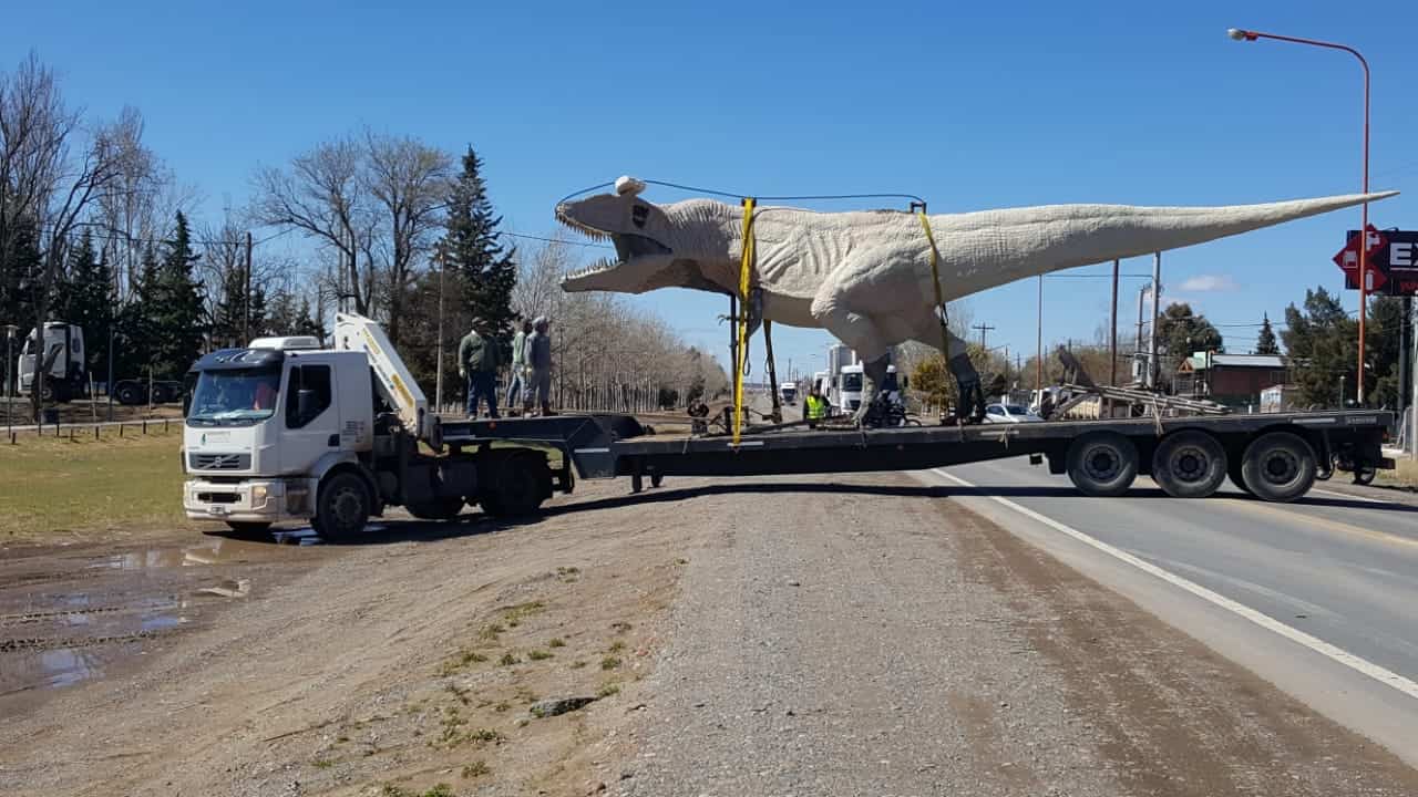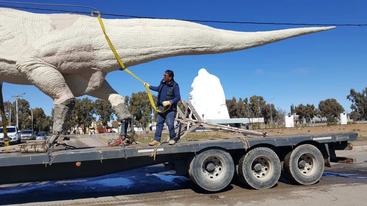 La escultura del dinosaurio “Mapusaurus” fue trasladada hoy al mediodía desde el taller del escultor Aldo Beroisa hasta su destino final, en Plaza Huincul.
