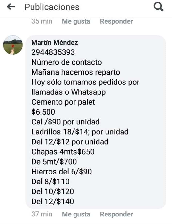 El hombre explicó que, a través de la red social Facebook circuló una publicación sobre el cierre de un corralón llamado “Martínez”de materiales de Zapala. En consecuencia, se vendía toda la mercadería que les quedaba en stock al 50%. Los precios eran atractivos, por lo que el vecino se contactó con las personas que habían publicado.