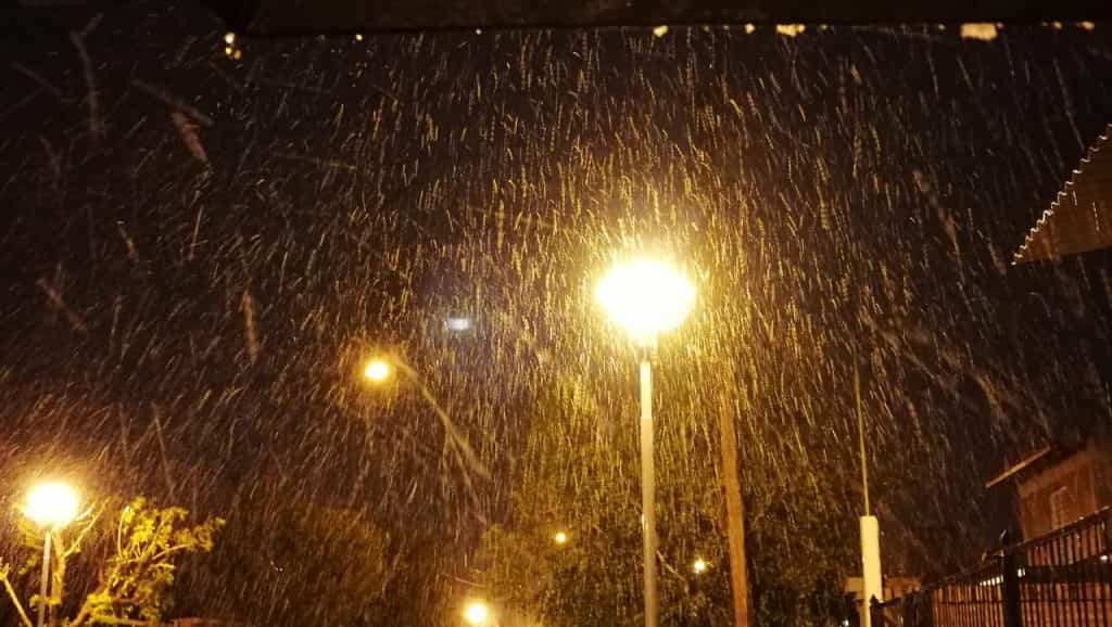 En la primera hora de esta noche, al frío y el viento, se le sumaron las precipitaciones níveas que si bien en un primer momento no logró conservarse, con el correr del tiempo, si se observó que empezaba a acumularse.