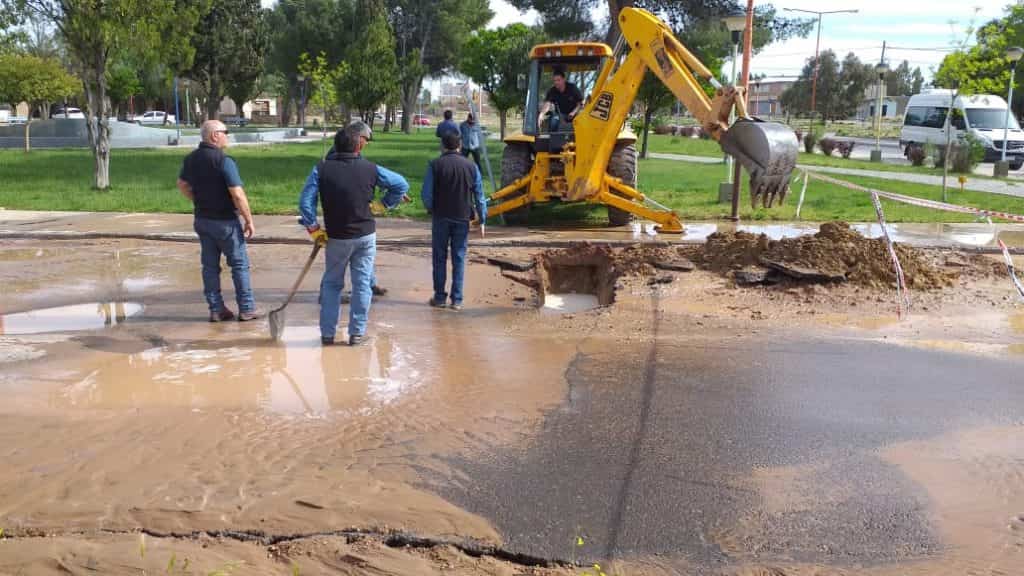 Luego de establecerse que la rotura era en el caño que suministra el agua potable a Plaza Huincul, se iniciaron los trabajos para dar una solución rápida para afrontar la emergencia.