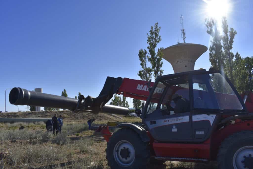 Los 14 tramos de tubería de 400 mm de diámetro llegaron ayer a la ciudad y desde esta mañana comenzó la maniobra de nomralizar para restablecer el suministro de agua a Plaza Huincul.