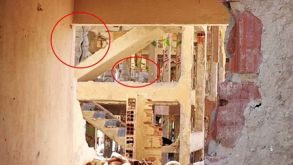 A simple vista se pueden ver las bolsas con arena instaladas en los primeros pisos. No hay una fecha establecida para realizar la demolición final.