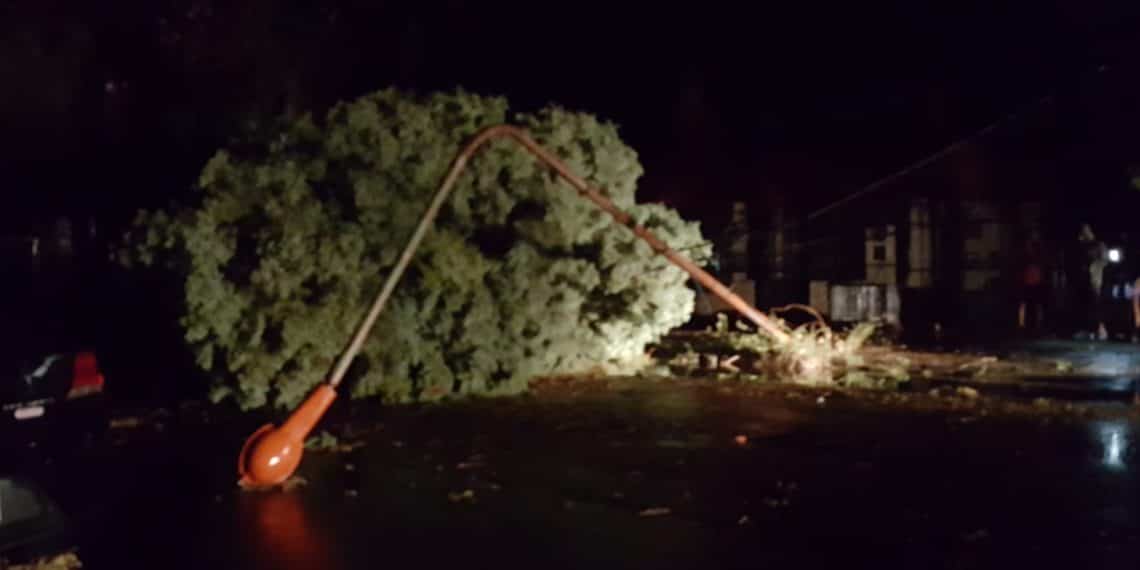La primera información indica que en Eguinoa entre Chubut y Santa Cruz se cayó un árbol con el poste de energía incluido (foto). Pero hay decenas de gajos por todas las calles. Bomberos de Cutral Co pidieron a los vecinos que no salgan de sus viviendas “a pasear” porque entorpecen el accionar de las dotaciones.