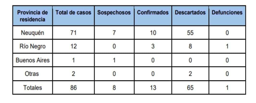 Y se indicó que “se trata de una mujer de 68 años, oriunda de San Martín de los Andes, con un antecedente de viaje a España. El segundo, es un hombre de 44 años, de la capital neuquina, sobre el cual se investiga su nexo epidemiológico. El tercero, es una mujer de 40 años oriunda de la capital neuquina, con un antecedente de viaje a Estados Unidos, la cual se encuentra actualmente en la provincia de Buenos Aires (nunca llegó a Neuquén). Sobre el restante informado por Nación, aún se espera confirmación.